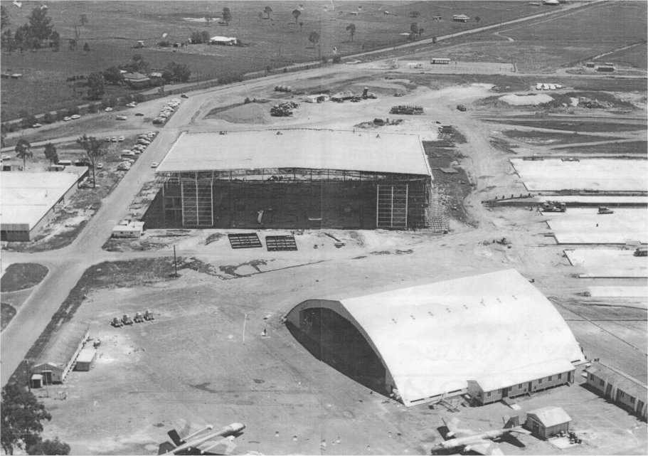 In May 1943, the construction of two 170' span structures began by contractor M R Hornibrook P/L, to house B-24 Liberators. They were located on the southern fringe of the building area and became well known to RAAF crews ferrying B-24s across the Pacific, and those of the RAAF Liberator squadrons picking up their assigned machines in 1944 and 1945. These hangars served until their demolition to make way for the huge maintenance facility (Hangar 410) now operated by 501 Wing.