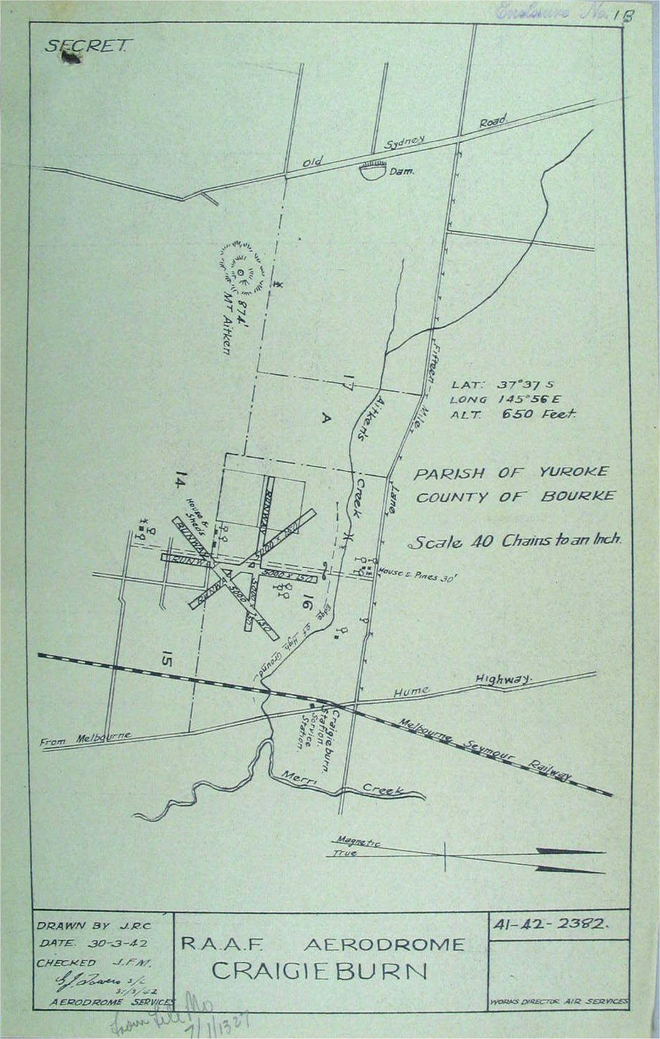 Christine Keitel contacted me in November 2008 and indicated she had carried out some research on this proposed airfield and downloaded all the documents from the Australian Archives quite a while ago. Christine believes the airfield was never built and they seemed to abandon the plans for the airfield at Craigieburn in favour of an airfield at Glenroy in Victoria. Apparently the Broadmeadows Historical Society has a picture of the old airfield Glenroy on their wall at Broadmeadows.