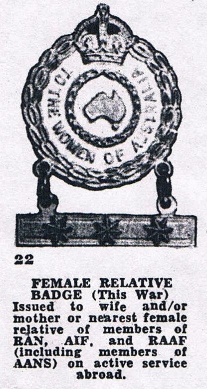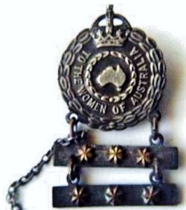 The WWII Female Relatives Badge was issued by the Australian Government to either the Wife, Mother or nearest Female Relative of any Service Man/Woman from the same family serving with the Australian forces during WWII. Each service person being represented by a single gold star on the suspension bar. The main section of the badge carried the words- "TO THE WOMEN OF AUSTRALIA" .