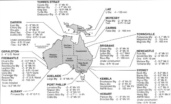 The following map is from the book "The Gunners - A History of Australian Artillery" by David Horner. It shows fixed defences in Australia, August 1944