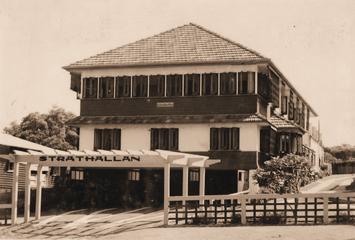 "Strathallan" was partially built by a Mr. Wruck for Miss Hilda Allen-Waters and her sister Miss Jess Allen-Waters in about 1935/36. "Strathallan" was then completed by builder, Harry Liekefett and his son Eric Liekefett, and John Mayes of Caloundra. Other spelling variations for the Guest House are "Strath Allen" and "Strathallen". The two sisters' home called "Strathaird" was built on the block to the east of "Strathallan" at the same time.
