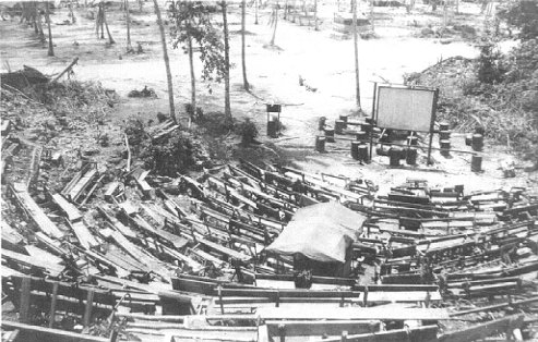 The above photographs were taken by Rudolph P. Arndt. He used a makeshift darkroom in the Squadron area. Chemicals were mixed in trays made from old aircraft gasoline tanks, etc. Rudolph was at Owi for about 6 months. He then returned to USA via Leyte, Philippine Islands. Rudpolp told me that he only attended one movie in the above open air theater. He missed out seeing Bob Hope and all the other famous entertainers during his tour of duty in the South West Pacific area.