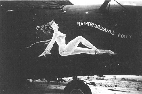 B-24 Liberator "Feathermerchants Folly" of 43rd Bomb Group - Owi Island - Netherlands East Indies - October 1944. "Feathermerchant" is slang for a "slacker in time of war" |