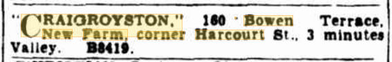 NOTE:- When you do a search for 160 Bowen Terrace on Google Earth it puts the location on the comer of Kent Street rather than Harcort Street. It was definitely on corner of Harcourt Street as per the advertisement below.