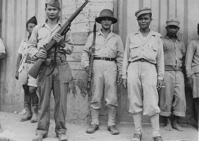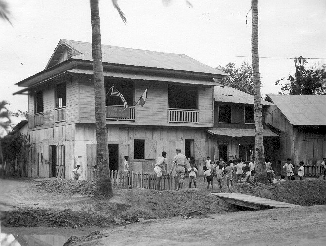 Once again we had time to do some exploring and sight seeing - camera in hand. Got to Tacloban one day with Capt. Speith and once again we saw a town that had been shot up pretty badly. Again we photographed a beautiful church that had taken its lumps - nothing is sacred in war. Also found a statue in a little square honoring the Phillipine Boy Scouts. Capt. Speith had been active in scouting back home, so we had to get a photo of him by the statue. Judging from the town and the country side it was obvious that the Philippines was not a rich nation. An awful lot of poverty anyplace one looked. But one thing was for sure, the Phillipinos were might happy the have the Yanks back on board. Any time we ran into them there were lots of smiling faces.