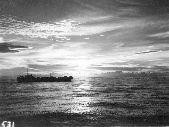 On the 28th of Dec. 1944 we reloaded our equipment on an LST and about midnite shoved off. This time we were headed for the Island of Mindoro on the west side of the archipelago, where it was the dry season. The next morning we had rounded the end of Leyte and were heading west thru the Philippine Straits, in a pretty good sized convoy. We situated somewhere in the middle and couldn't see either end of the convoy. About 10:30 AM four of us were playing cards topside, when three Jap planes came buzzing in low from our right side (never could tell starboard from port). One flew right over us a headed for a Liberty Ship one lane over and one ship back. We had got over to the rail watching as it dove right into the ship. Ammunition ship, went strait up and mushroomed out like the A-bomb explosions. When I saw that I grabbed the rail and bent my knees, as I knew there was going to be a hell of a concussion. One of the guys had started down a hatch and it blew him to the bottom. When the pieces started coming down we scrambled to get under something. We had come face to face with the divine wind -- Kamikazes.