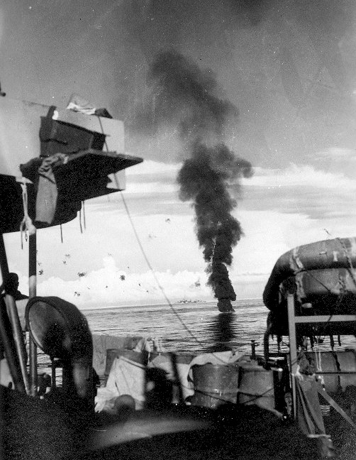 There were some who wouldn't come topside, as they didn't want to see what was going on. I was just the opposite, the next two days I went below decks only to go to the "head" as the navy called it. There was no way I was going to below decks if we got hit. I wanted to be right by the rail, so I could get the hell off the sucker. I staked out my claim (with my camera) under a twin 40mm gun position on top of a hatch, towards the front of the ship on the left side. There I stayed with my mae-west, steel helmet and my Speed Graphic. For 2 days they came at us, day and nite. The navy gunners, bless their navy souls, succeeded in knocking 25 of them out of the sky, but they suceeded in sinking 8 ships out of our convoy. I got photos of three of them that hit the water close to our ship, but I missed the best shot. One of them had cleared the ship on our left, and was heading right for our LST. I could see the 40mm tracers going right into his nose. I had the camera up and ready to trip the shutter when he exploded - explode, it did and I tripped the shutter. Just one problem, I had already tripped it, I was so damned nervous. When we processed the film all I had was a plane in the distance. Oh well, you win some, you lose some and some are rained out.