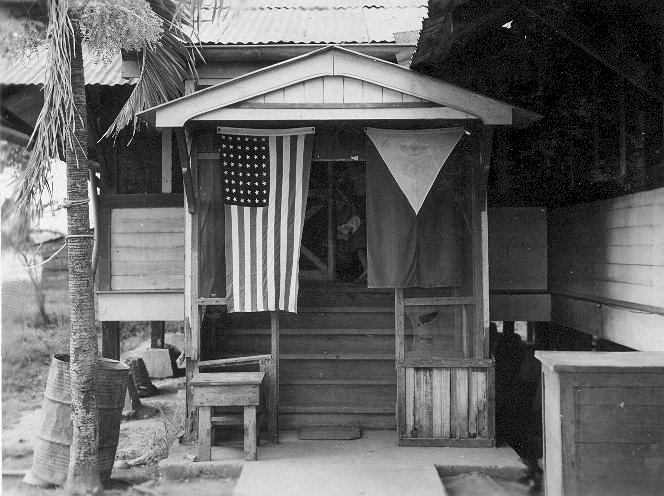 Another night I had gone to bed, the only one in the tent. Two of them were still in Hollandia and the fourth guy was on night duty. About 2:00 AM I was awakened by rain in my face. A typhoon had blown in from Leyte Gulf with 90 MPH winds, and the rain was coming horizontally. About that time one of the cots had got upset, I stood up to set it right, and my own cot hit me right in the backside and about knocked me down.I sat down with that cot at my back, and there I stayed. Next morning there were three tents standing that had been framed with bamboo - ours was one of them. The next day was spent putting the camp back together; and we had experience another of the oddities of the South Pacific.