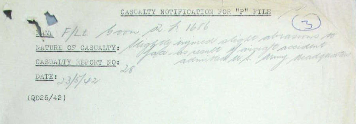 The above Casualty Notification on Roy Goon's file is dated 23 May 1942, which differs from the date of 25 May 1942 shown on the 34 Squadron ORB for his crash in Tiger Moth A17-469. This Casualty Notification shows that he was slightly injured with slight abrasions to the face as a result of an aircraft accident and he was admitted to the US Army Headquarters (presumably a hospital).