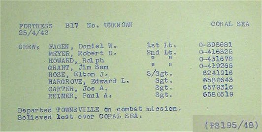 On the 25 April 1942, USAAF B-17 Flying Fortress, #41-2505, of the 30th Bomb Squadron, 19th Bomb Group, left Cloncurry on its 29th combat mission to New Guinea with two other B-17's. They landed at Townsville where they were loaded with their bombs and more fuel. The three B-17's proceeded to 7-Mile Strip, at Port Moresby, and landed to await their mission take off time of 03.30am which would place them over their target at Rabaul at dawn. #41-2505 was last seen about five miles southeast of Port Moresby while the formation was climbing to cruising altitude. About an hour later at about 4:45am, a B-17 was heard to fly over 7-mile strip in the darkness and it was assumed that it was this B-17. It was believed to have been lost over the Coral Sea. The crew of 8 personnel were believed killed. They were as follows:-