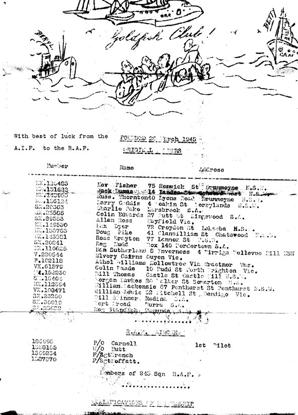 NX. 126483 Neville William Fisher 75, Renwick Street, Drummoyne, N.S.W. NX. 131628 John "Jack" Thomas Henry Dumas 14, Iandra Streeet, Concord West, N.S.W. NX. 148903 Russell Stewart Thornton 40, Lyons Road, Drummoyne, N.S.W. NX. 156124 Harry George Caddis 4, Meakin Street, Marylands, N.S.W. SX. 20363 Clarence "Charlie" Rake Kersbrook, S.A. SX. 23585 Colin Albert Edwards 27, Putt Street, Kingswood, S.A. SX. 89553 Robert Allan Ross Mayfield, Victoria. NX. 149530 Max Selwyn Dyer 72, Croydon Street, Lakemba, N.S.W. NX. 156763 John Douglas Pike 41, Clanwilliam Street, Chatswood, N.S.W. NX. 143581 Ross Drayton 77, Lennox Street, N.S.W. SX. 20241 Reginald Clarence Hudd Box 140, Bordertown, S.A. NX. 110625 Daniel Tait Sutherland 8, Inverness, 4, Birriga Bellevue Hill, N.S.W. V. 220504 James Elvery Cairns Ouyen, Victoria. T. 102008 Athol Thomas Williams Hollowtree, via Graetnor, Tasmania. VX. 61579 Colin Lorrain Baade 10, Budd Street, North Brighton, Victoria. NX? 152230 William "Bill" Albert Thomas Castle Street, Castle Hill, N.S.W. SX. 16404 Morgan Ranembe Hawkes 20, Walker Street, Somerton, S.A. NX. 112694 William Robert Mackenzie 67, Penthurst Street, Penthurst, N.S.W. VX. 108471 William Oscar Lewis 52, Mitchel Street, Bendigo, Victoria. SX. 23260 William "Bill" Ewart Skinner Radina, S.A. SX. 30019 Burt Ludwig Broad Burra S.A. SX. 23622 Reginald Kenneth Standish Tanunda, S.A.