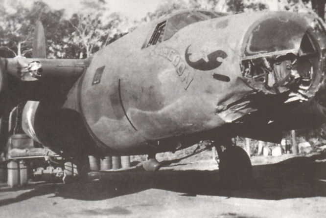 Note the crumpled nose of B-26 Marauder #40-1403, "Bunagoon"