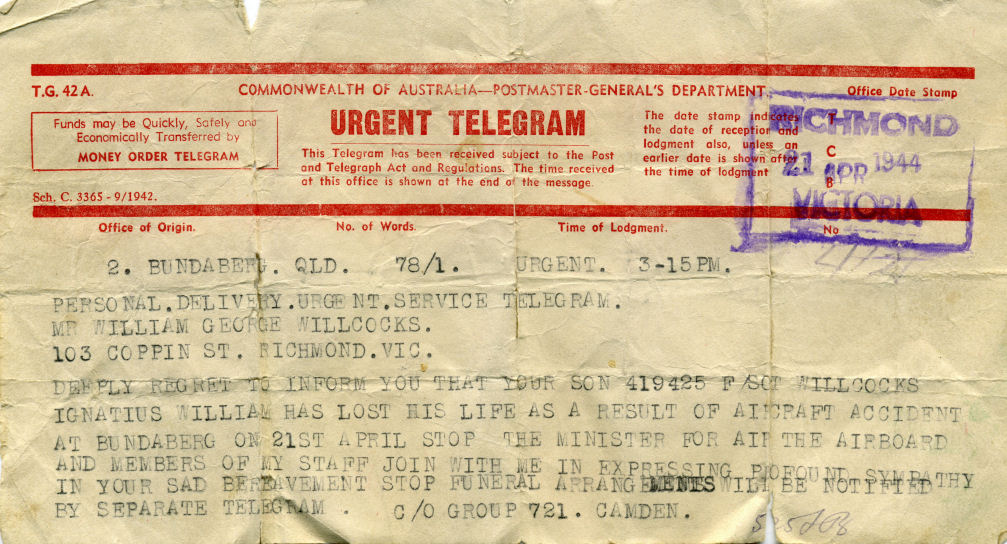 Telegram received by Mr. William George Willcocks, father of F/Sgt. Ignatius Willcocks