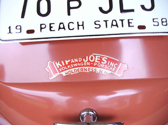Original dealer sticker on the motor hood of Steve Sorrells' 1958 VW