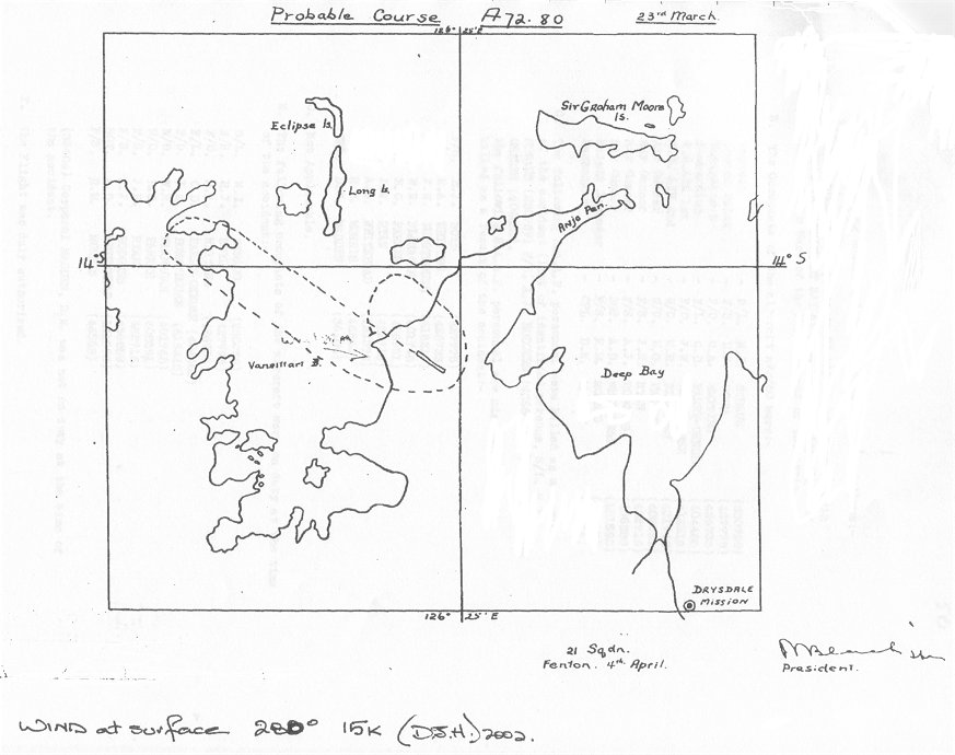 David Hursthouse, the son of F/O John Wilson Hursthouse, has flown a little in gliders and finds it difficult to believe that a pilot would not make sure that his controls were free prior to takeoff. The report indicates that the aircraft was seen to halt prior to actual takeoff for the purpose of a cockpit check. According to a diagram that David has the aircraft flew north west across Vansittart Bay to the next headland before doing a complete 180 and flying back towards the airfield. It also seems to have flown round behind the strip to the south west before circling back into Vansittart Bay. It was heading towards the airstrip when it ditched close to the shore.