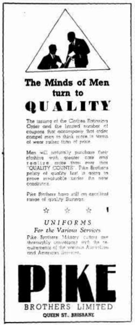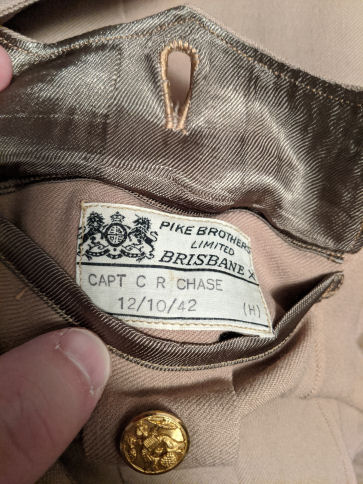 The Jacket was made by Pike Brothers Limited in Queen Street, Brisbane. Mr. Wyn Pike, the governing director of Pike Brothers Ltd., Brisbane was appointed the Commander of the Queensland Wing (No. 3 Cadet Wing) of the Air Training Corps in August 1941 with the rank of Wing-Commander A.T.C.