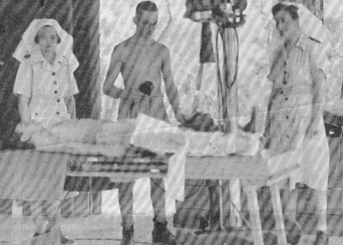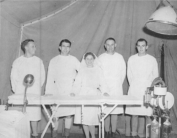 Thompson (Surgeon) and Sgt ‘Dusty’ Hill, all facing, the Operating Table.