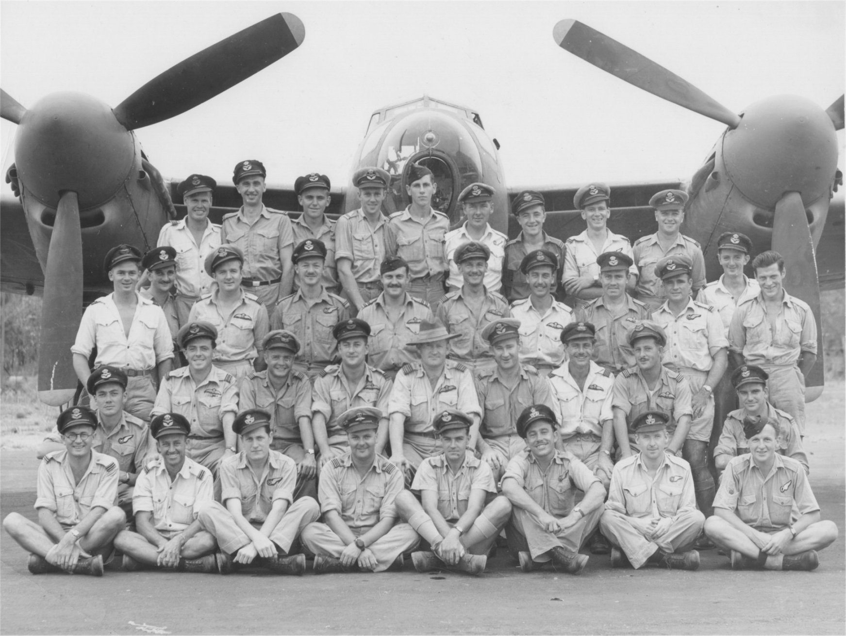 Group portrait of ground crew in front of a PR Mk XVI-Mosquito, 87 PR Squadron, RAAF, August 1945