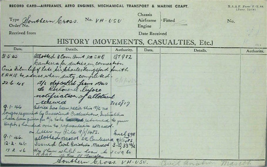 Sir Charles Kingsford Smith's famous Southern Cross, VH-USU was allocated to 3 Communication Unit RAAF at Mascot Airfield on 31 May 1945 from SHQ, Canberra for duties in connection with Cine Film "Life of Late Sir Charles Kingsford Smith". Eastern Area HQ were to to advise when the duty was completed.