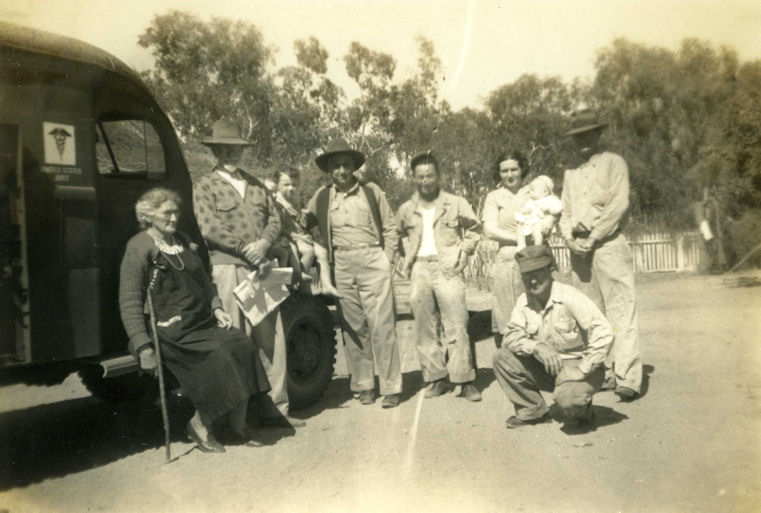 3 October 1945 - The US ambulance at Wambiana collecting the limited remains and limited clothing and a boot of American Airman who fell from the B-25 Mitchell on 28 September 1943. Left to Right:- Julia & Myles Lyons (John Lyons's grandparents), Frances Lyons (2yrs), Myles Lyons (4yrs) (John's brother and sister). Frank Carrington from a nearby property, a US soldier, Claire Lyons holding baby John (John's mother), John Lyons (John's father), US soldier kneeling