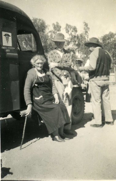 3 October 1945 - US ambulance at Wambiana collecting remains. Left to right:- Julia Lyons, Myles Lyons and Frank Carrington from Oakvale Station |