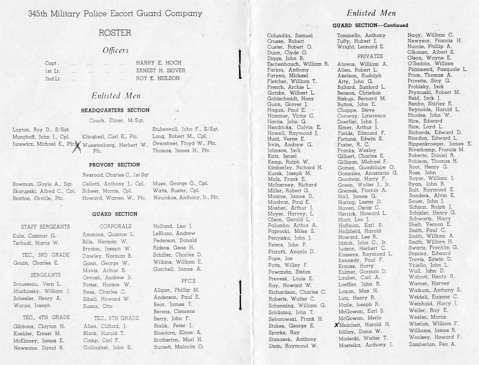 On 18 April 1945, Captain Harry E. Hoch (0-442739) was relieved assignment and command of the 345th MPEG Coy, and assigned to New Guinea Detention and Rehabilitations Company, and assigned to New Guinea Detention and Rehabilitation Center, APO 503, effective 25 April 1945. On 19 April 1945, 1st Lt. Charles R. Wing (0-461580) assumed command of the 345th MPEG Coy relieving Captain Harry E. Hoch (0-442739).