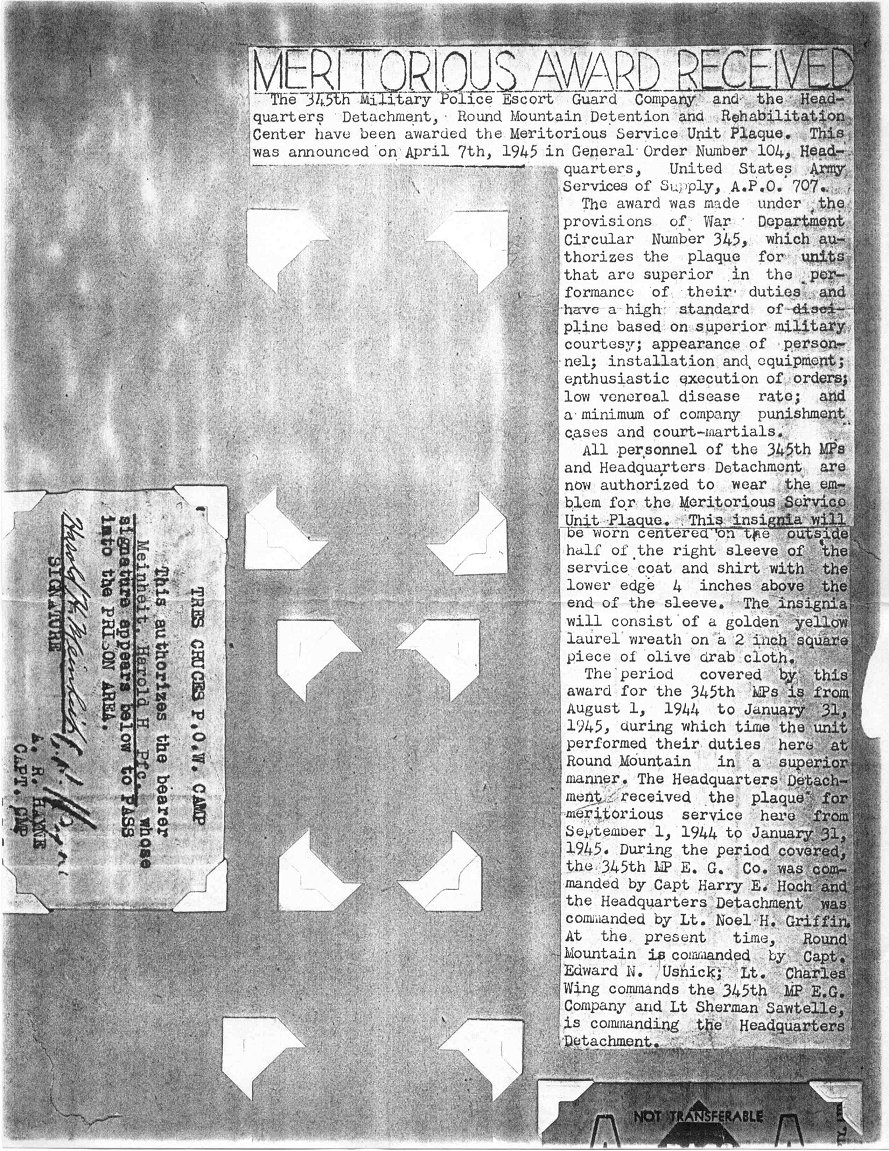 On 7 April 1945, General Order 104, Headquarters, US Army Services of Supply cited the 345th MPEG Coy, and the headquarters detachment of the Round Mountain Detention and Rehabilitation Center, the Meritorious Services Unit Plaque for superior performance of their duties and appearances.