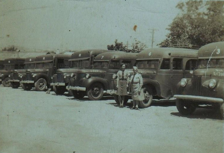 Mary Florence Crawford on the left and Elsie E.M. Moss with vehicles driven by the WNELs